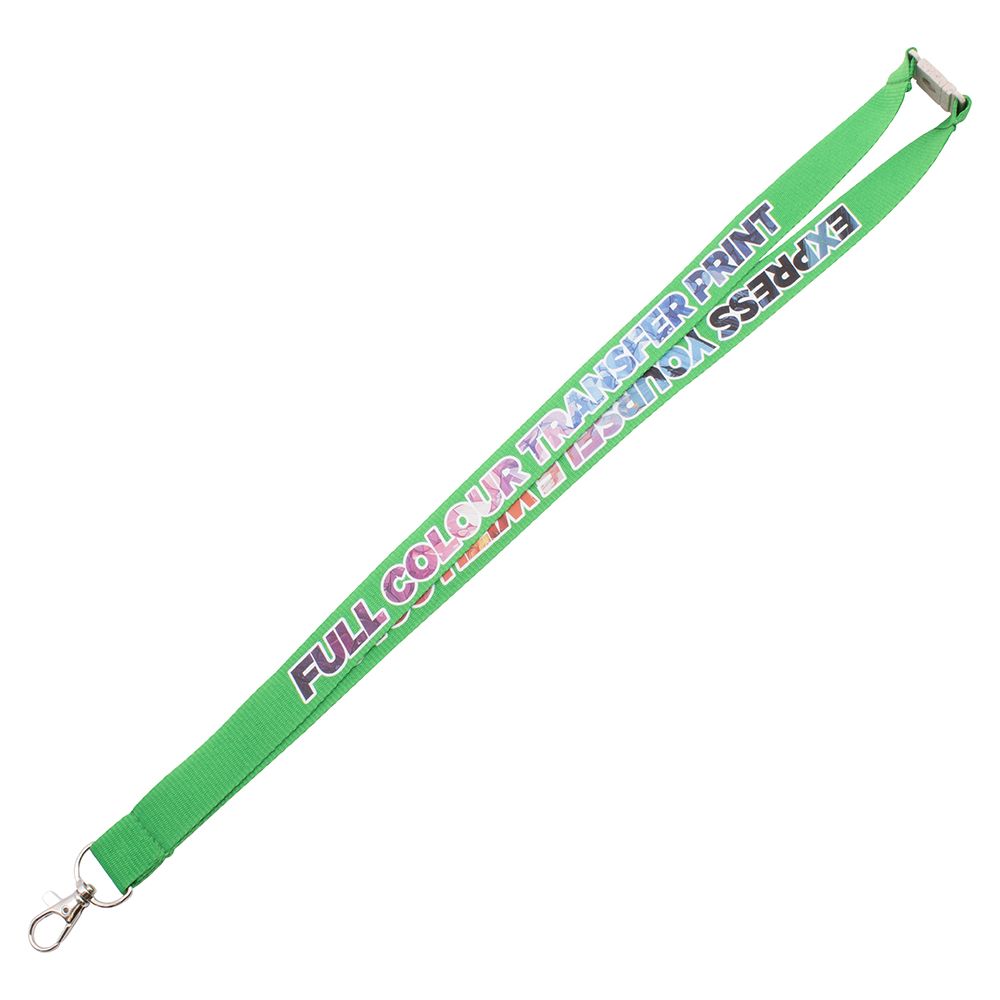 A UK-stocked 20mm flat recycled PET lanyard available plain next-day or with a 1 colour screen print on 1 side or a full colour transfer print on 1 side in 8-10 working days.