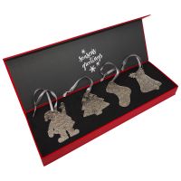 A set of 4 fun and festive zinc alloy Christmas tree decorations with a pre-engraved ‘Season’s greetings’ snowflake design on the front and a personalised laser engraving on the plain reverse. Supplied in a card presentation box with a magnetic closure. The elegant box comes in plain red and features an EVA insert for holding the decorations and a pre-printed 'Season's greetings' design on the inside of the lid.
